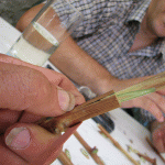 2. Tehnika navrtanja. Kako je na raspolaganju bilo ljudi, raspored je bio slijedeći: (1) Vrši otvaranje raskola i stavlja umetak (plosnati šrafciger) da se raskol ne zatvori, (2) Priprema plemku i umeće je u raskol, (3) Veže plemku i maže voćarskim voskom. Bitno je samo da se kora podloge i kora plemke dodiruju (cijepi se na rub). Može biti jedna ili dvije plemke, ali uglavnom radim s jednom plemkom.